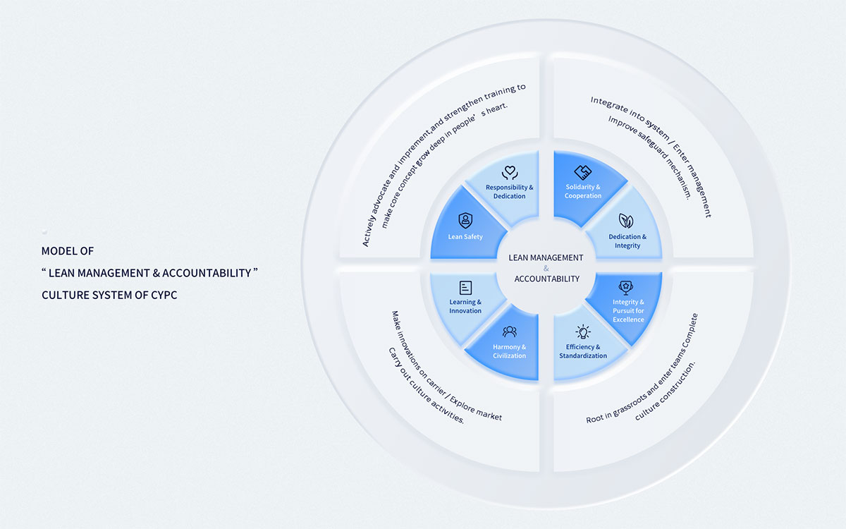 The “Lean Management & Accountability” culture system strives to build the mainstream culture system of CYPC that complies with the advancing direction of advanced socialist culture with distinctive time features, rich management connotation and characteristics. Taking lean safety as its core, it pursues responsibility and dedication, and is based on collaboration and integrity, driven by learning and innovation, backed by harmonious and civilized environment, and aimed at excellent, efficient, and standardized services.